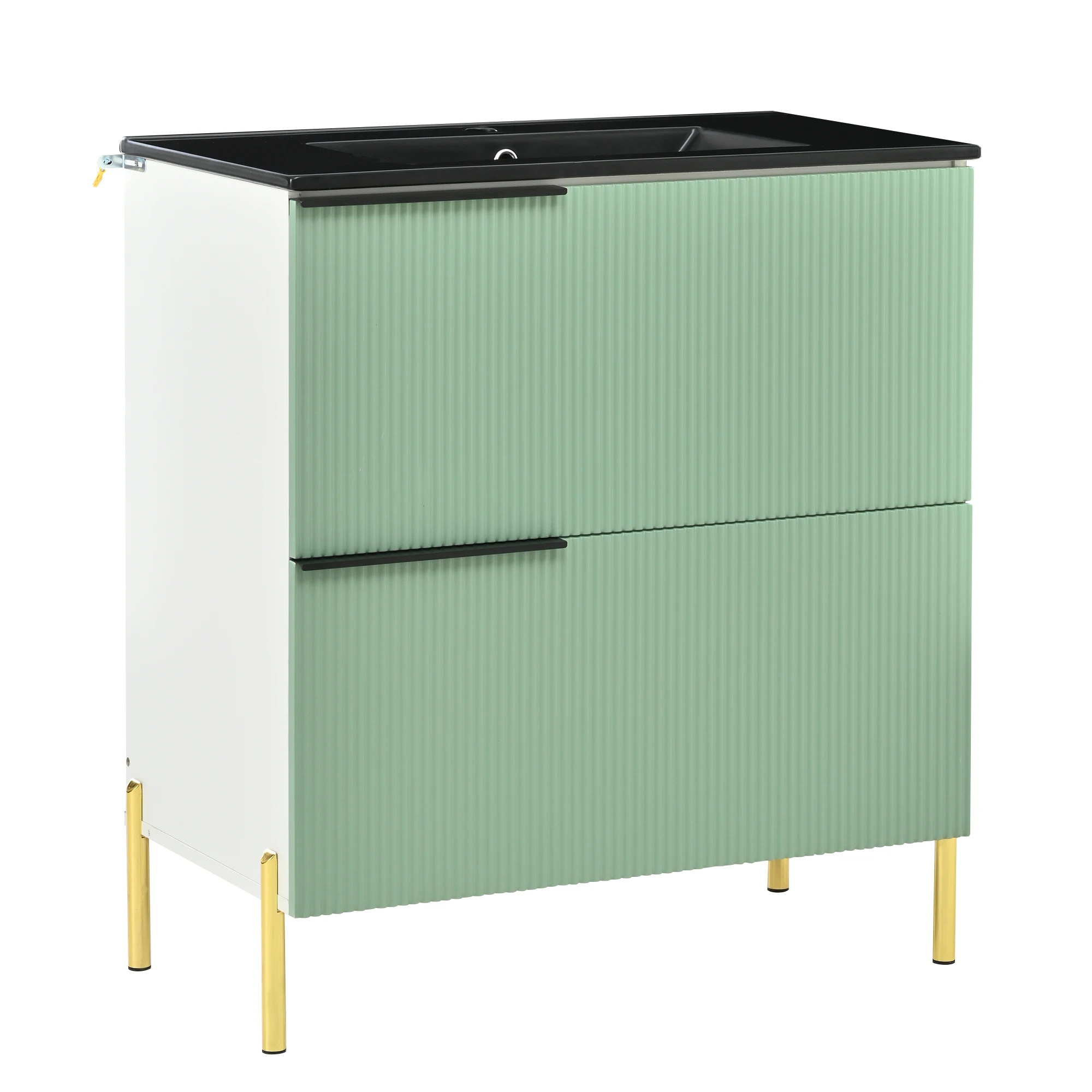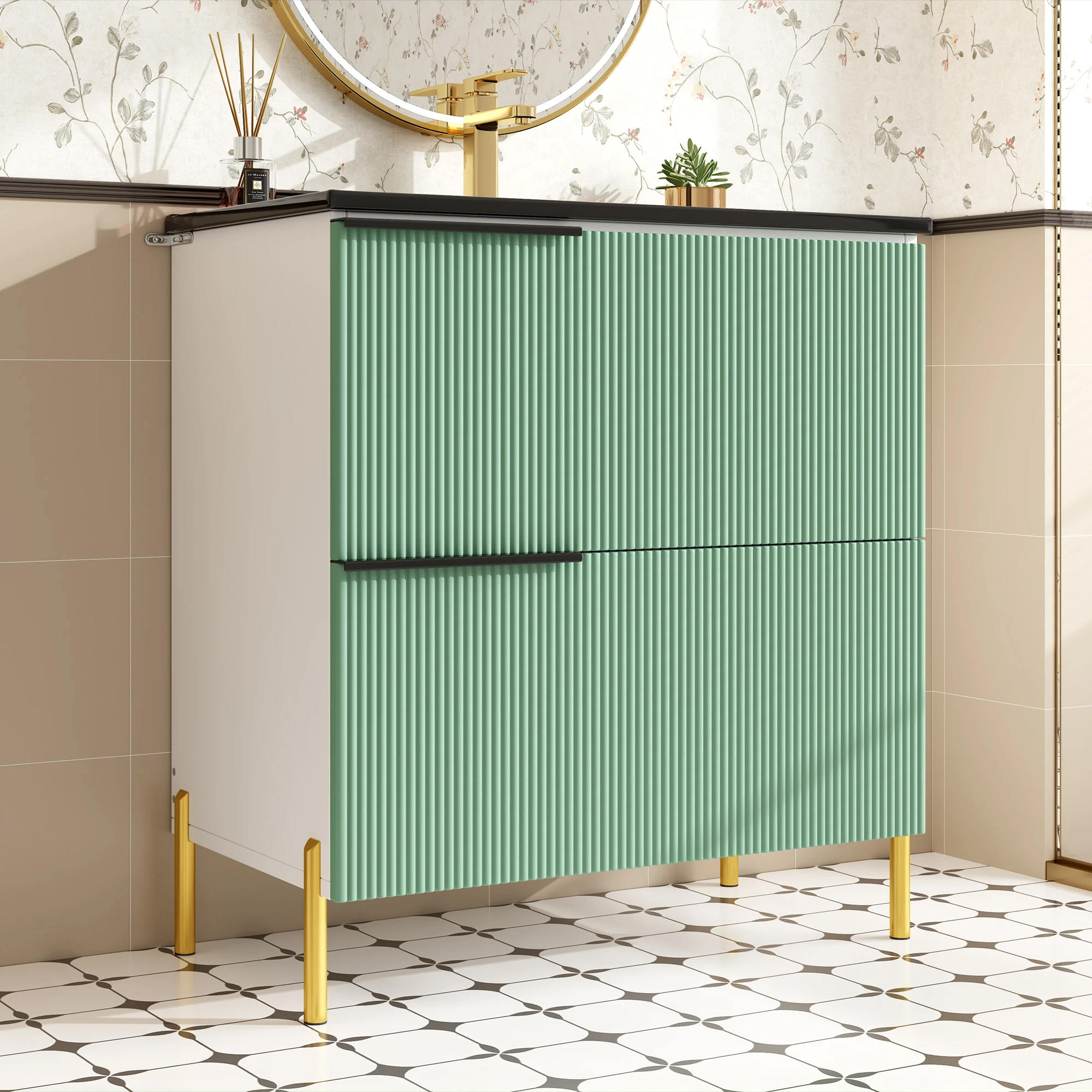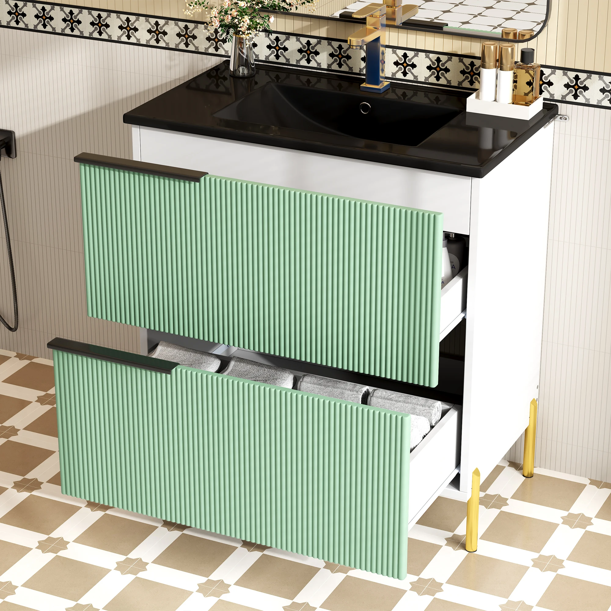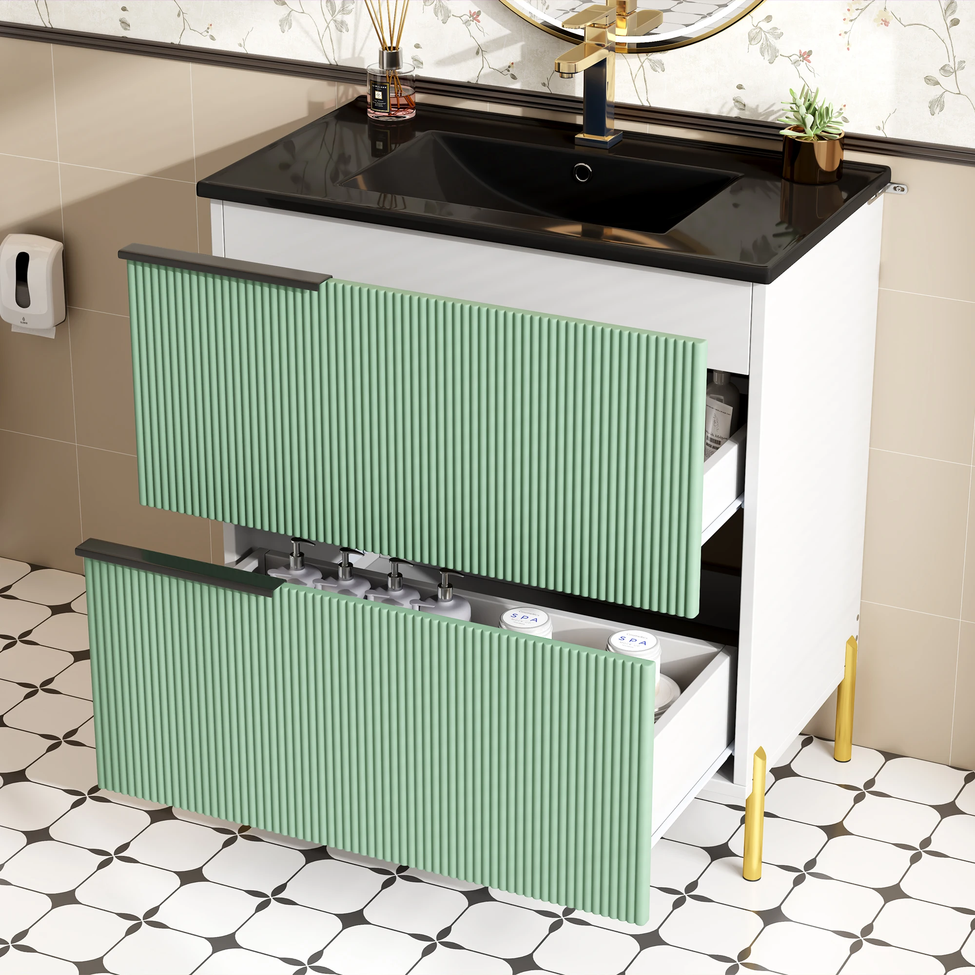 1.Anspruchsvolles und attraktives Design: Die grünen Schubladenfronten und schwarzen Metallgriffe sorgen für einen auffälligen Kontrast.Die Farbkombination ist elegant und modern, das Gesamterscheinungsbild ist hochwertig und wertet mühelos den Stil jedes Badezimmers auf. 2.Umweltfreundliche und langlebige Materialien: Der Schrankkörper besteht aus mit Melaminfolie beschichteten MDF-Platten.Dies macht das Malen überflüssig, sorgt für Umweltfreundlichkeit und sorgt für Feuchtigkeits- und Abriebfestigkeit. 3.Glatter und leicht zu reinigender Keramikbecken: Das glatte, integrierte Keramikbecken hat eine dichte, nicht poröse Oberfläche, die das Anhaften von Schmutz erschwert.Die tägliche Reinigung ist sehr einfach und die Oberfläche behält lange sein glänzender, wie neuem Glanz. 4.Elegante und robuste Metallbeschläge: Die Metallgriffe und Füße verleihen dem Design nicht nur eine ästhetische Note, sondern sorgen auch für die strukturelle Stabilität und lange Haltbarkeit des Produkts. 5.Einfache und mühelose Montage: Dank der gut gestalteten Konstruktion des Produkts ist der Montageprozess klar und unkompliziert.Sie können es einfach installieren, indem Sie die Anweisungen befolgen – was Zeit und Mühe spart. 6. Organisationssystem mit deutlich angeordnetem Stauraum: Die Kombination aus Schubladen und Schranktüren bietet eine praktische Aufteilung des Stauraums. Dadurch bleibt Badezimmerzubehör organisiert und die Schminktischplatte sauber und ordentlich.