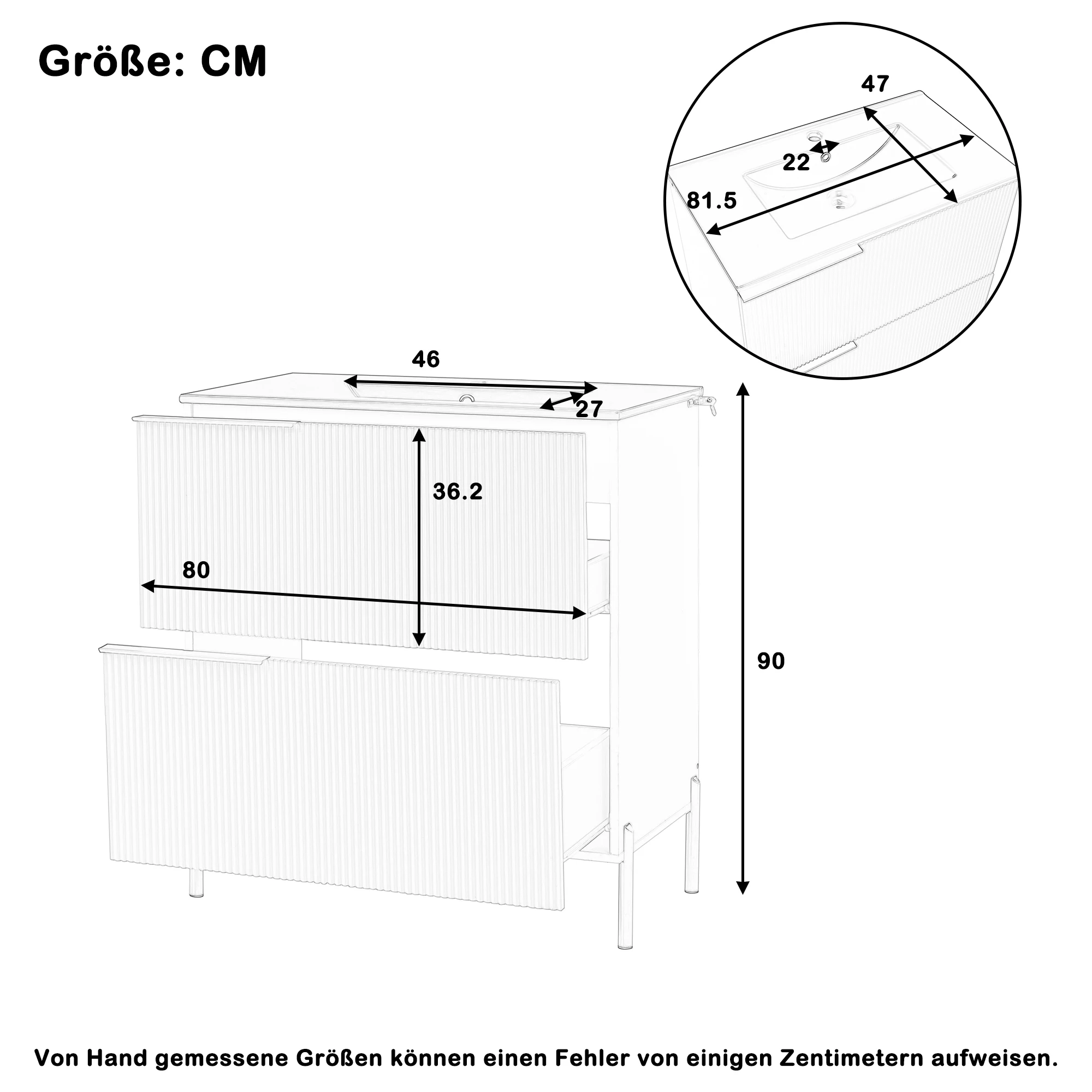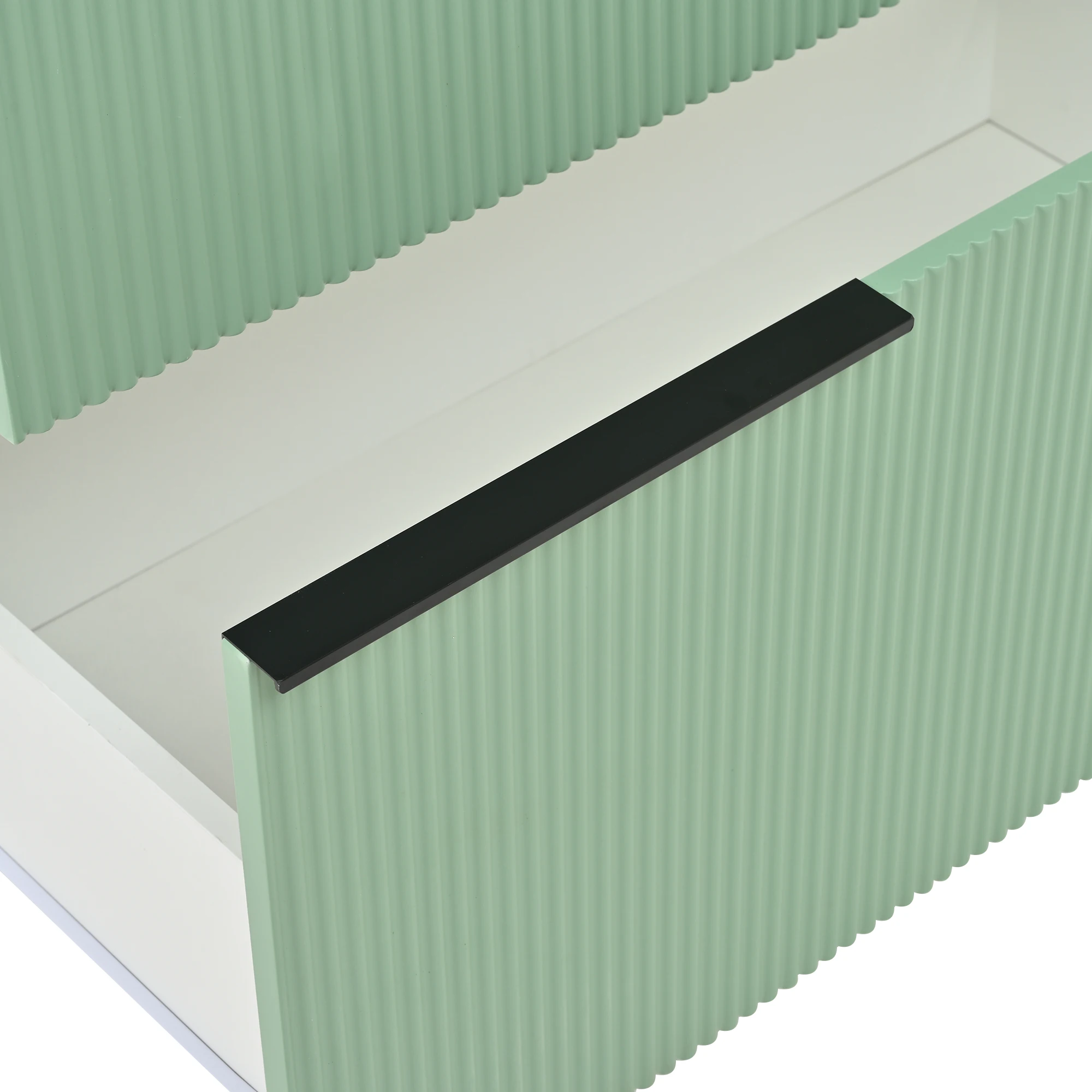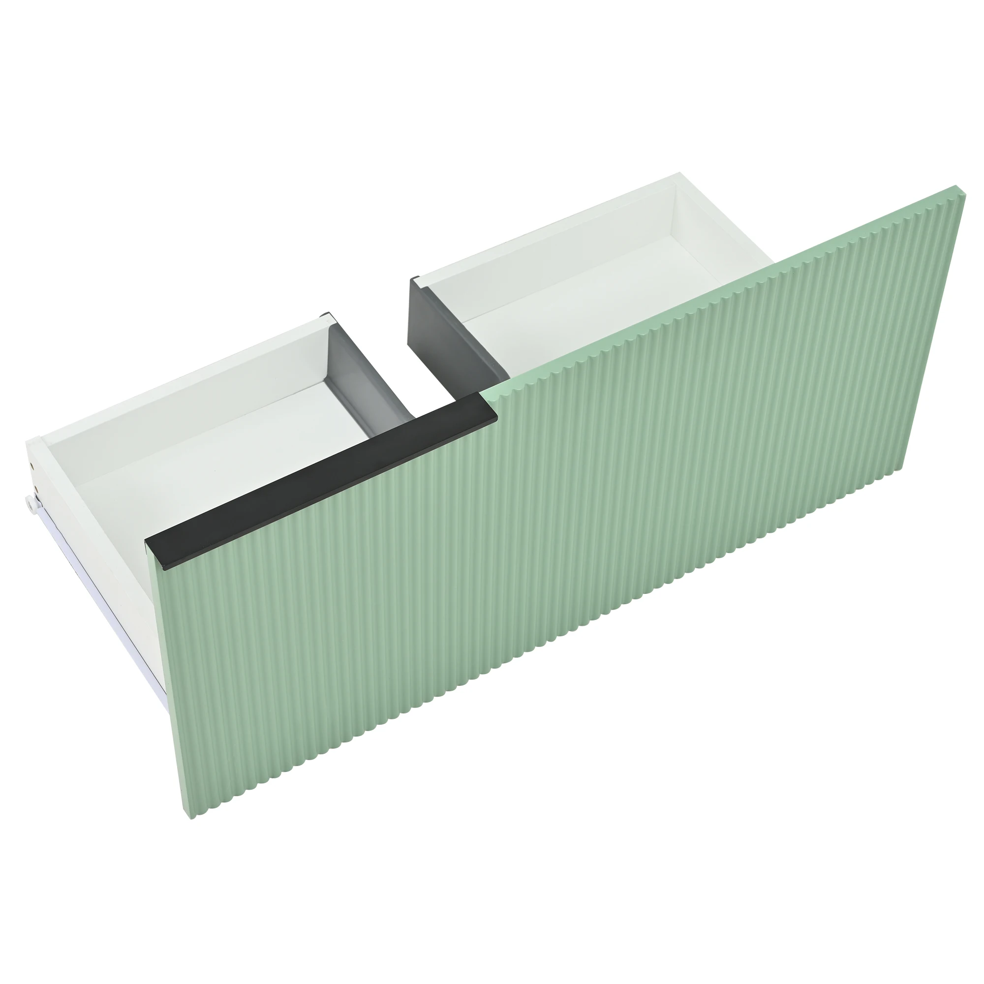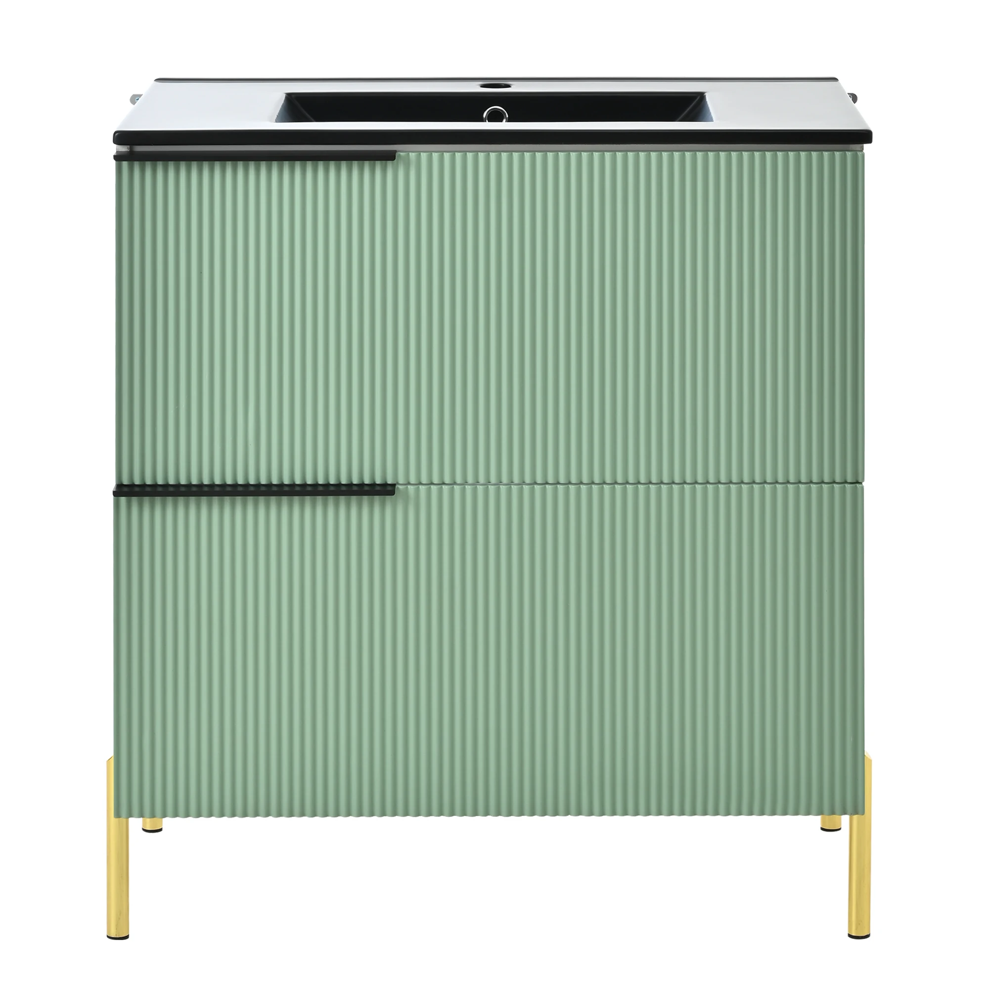 1.Anspruchsvolles und attraktives Design: Die grünen Schubladenfronten und schwarzen Metallgriffe sorgen für einen auffälligen Kontrast.Die Farbkombination ist elegant und modern, das Gesamterscheinungsbild ist hochwertig und wertet mühelos den Stil jedes Badezimmers auf. 2.Umweltfreundliche und langlebige Materialien: Der Schrankkörper besteht aus mit Melaminfolie beschichteten MDF-Platten.Dies macht das Malen überflüssig, sorgt für Umweltfreundlichkeit und sorgt für Feuchtigkeits- und Abriebfestigkeit. 3.Glatter und leicht zu reinigender Keramikbecken: Das glatte, integrierte Keramikbecken hat eine dichte, nicht poröse Oberfläche, die das Anhaften von Schmutz erschwert.Die tägliche Reinigung ist sehr einfach und die Oberfläche behält lange sein glänzender, wie neuem Glanz. 4.Elegante und robuste Metallbeschläge: Die Metallgriffe und Füße verleihen dem Design nicht nur eine ästhetische Note, sondern sorgen auch für die strukturelle Stabilität und lange Haltbarkeit des Produkts. 5.Einfache und mühelose Montage: Dank der gut gestalteten Konstruktion des Produkts ist der Montageprozess klar und unkompliziert.Sie können es einfach installieren, indem Sie die Anweisungen befolgen – was Zeit und Mühe spart. 6. Organisationssystem mit deutlich angeordnetem Stauraum: Die Kombination aus Schubladen und Schranktüren bietet eine praktische Aufteilung des Stauraums. Dadurch bleibt Badezimmerzubehör organisiert und die Schminktischplatte sauber und ordentlich.